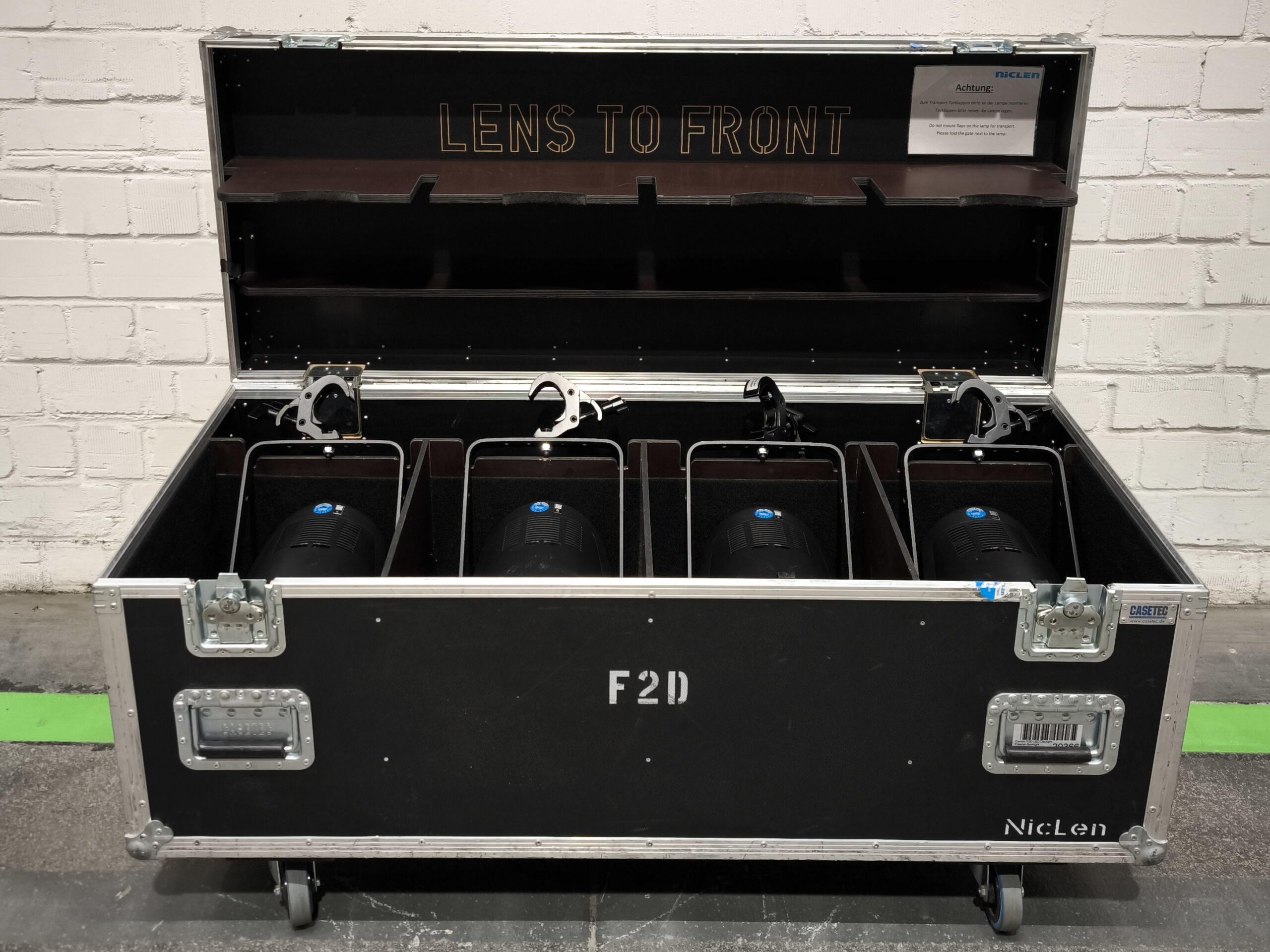 Der F2 D verfügt über 6 DMX-Steuermodi, eine schnelle Strobe-Funktion und 4 Dimmerkurven mit 16-Bit Auflösung und und einstellbarem Ansprechverhalten. Sechs wählbare Pulsweitenmodulationsfrequenzen bis 25 kHz sichern einen flackerfreien Betrieb, hocheffiziente Wärmerohr-Kühlung und ein temperaturgesteuerter Lüfter sorgen für optimale Funktion. Das robuste Gehäuse aus Aluminiumguss ist zur bequemen Konfiguration des Spotlights mit einem Drehgeber und OLED-Display ausgestattet, 5-polige DMX- Anschlüsse und Power-Twist-Netzbuchsen ermöglichen ein problemloses Hintereinanderschalten. Zum Lieferumfang gehören eine 8-fach Torblende, ein Gel-Rahmen und das Netzkabel.
