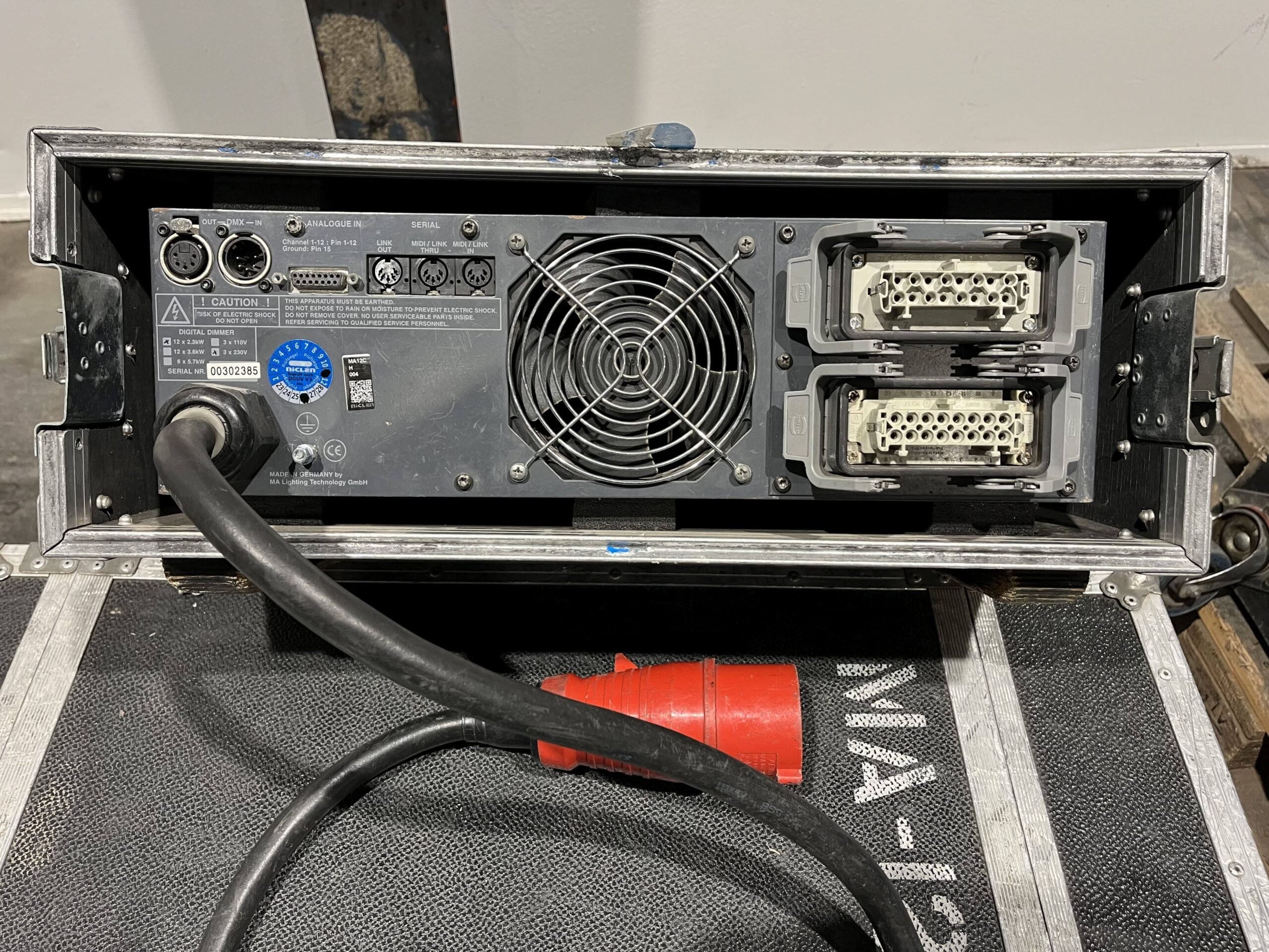 Digital-Dimmer-Einschub 19″/3HE mit zwölf Einzel-Kreisen 2,3kVA und eingebauter Fehlerstrom-Schutzeinrichtung (RCD, 30mA) auf der Eingangsseite. Sonstige Funktionen und Ausführung sind wie beim MA Digital Dimmer Touring 12 x 2,3kVA.